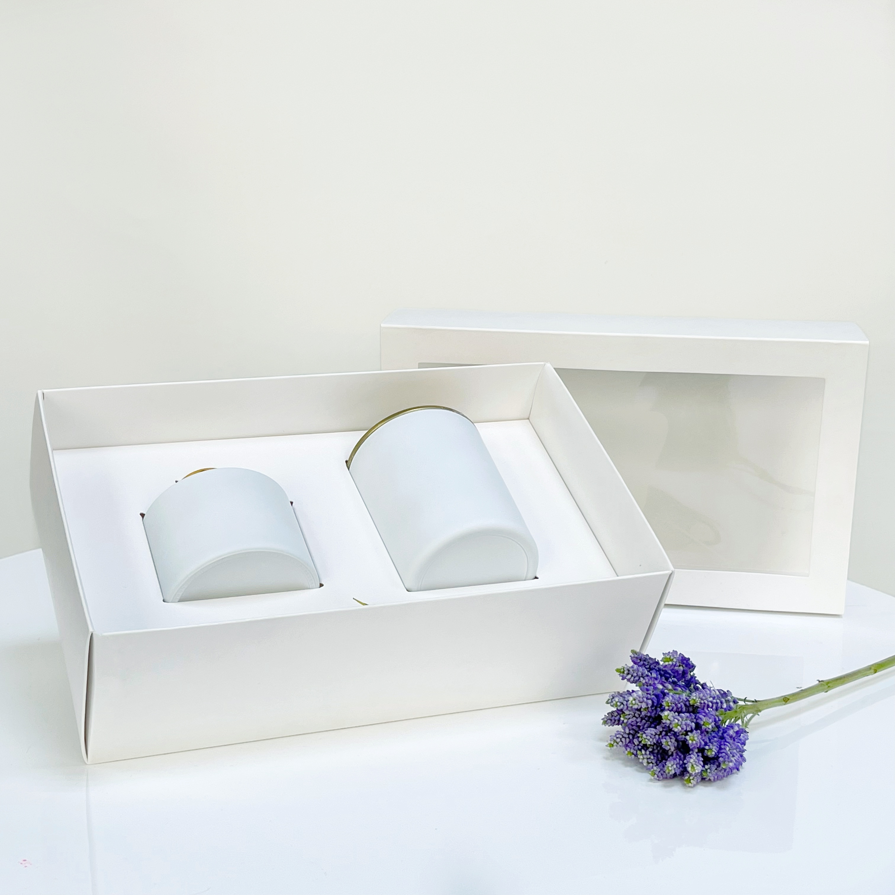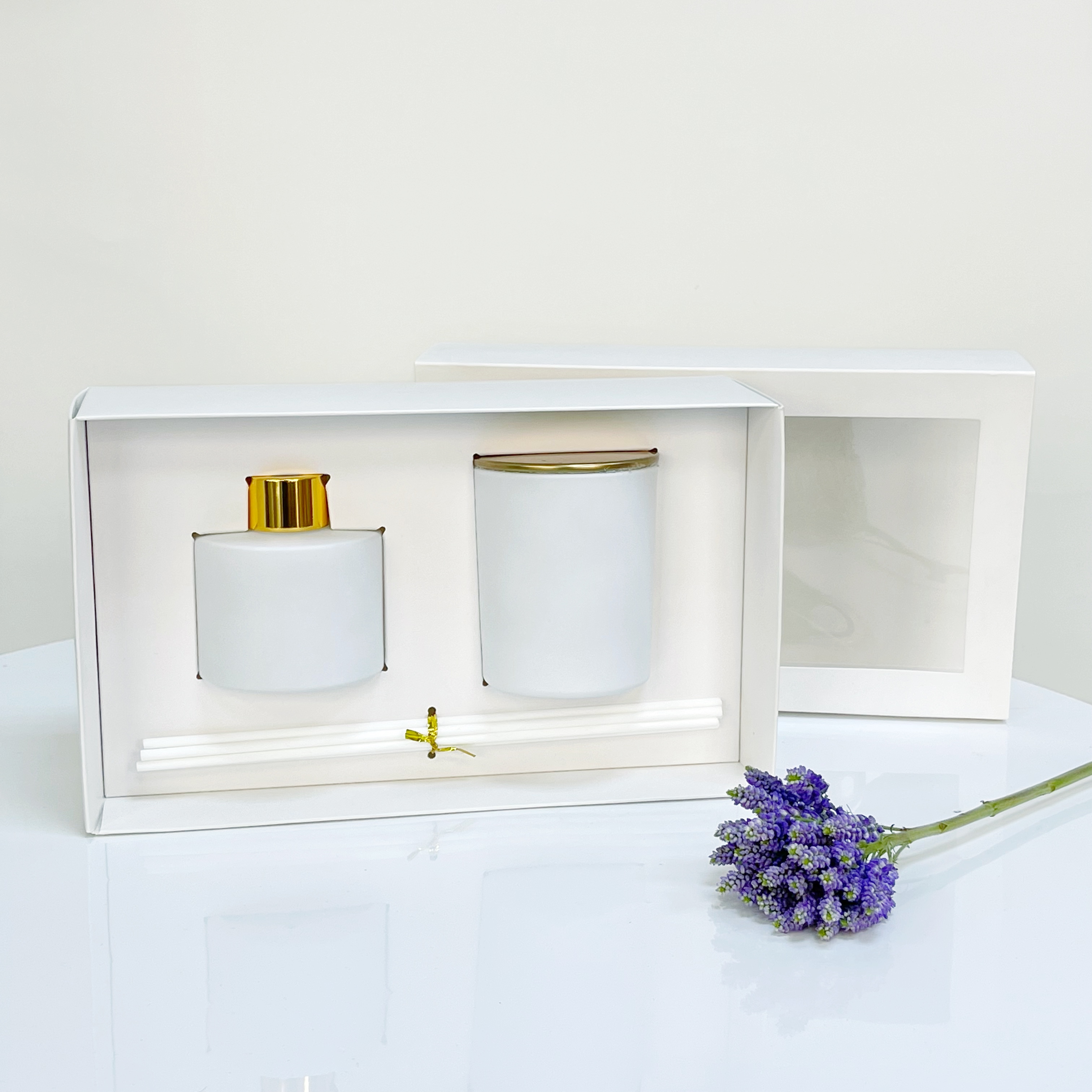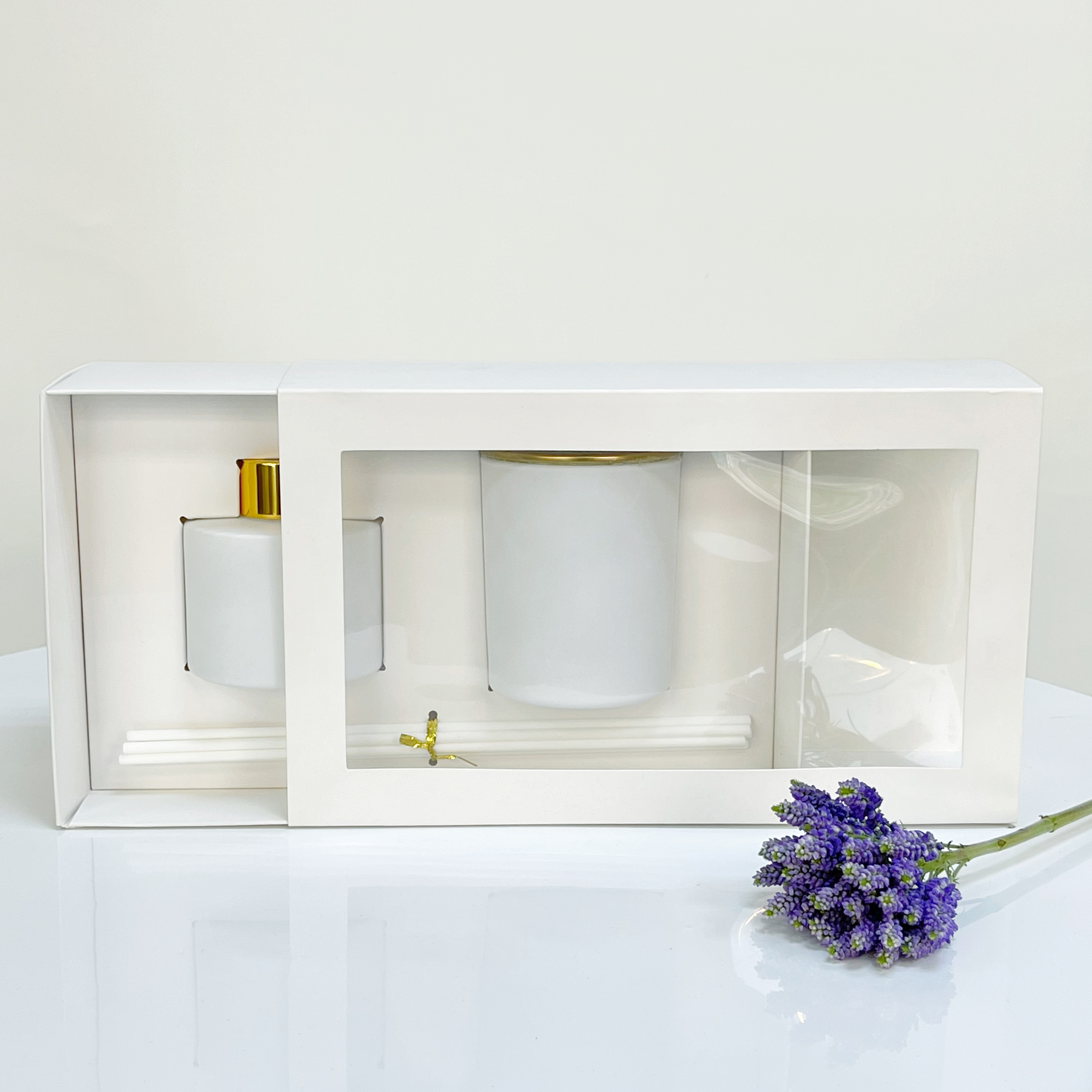 Описание: Белая матовая коробка с ложементом. Элегантный дизайн и удобная конструкция позволяют создать идеальный комплект для подарка свечи с диффузором.