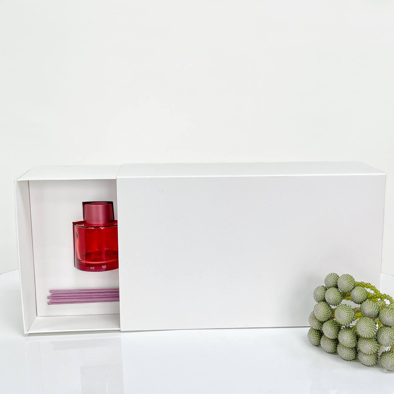 Материал коробки - картон. Легко собирается и доставляется в сложенном виде. Подходит для упаковки диффузоров и свечей . Флакон и стакан - стекло.
