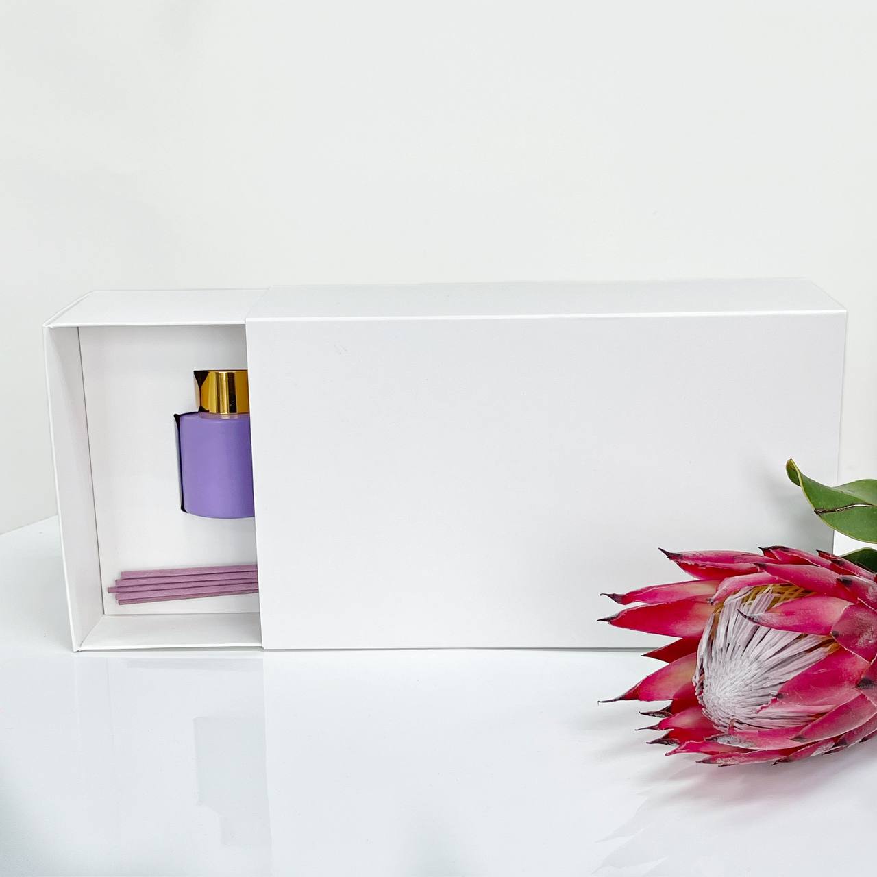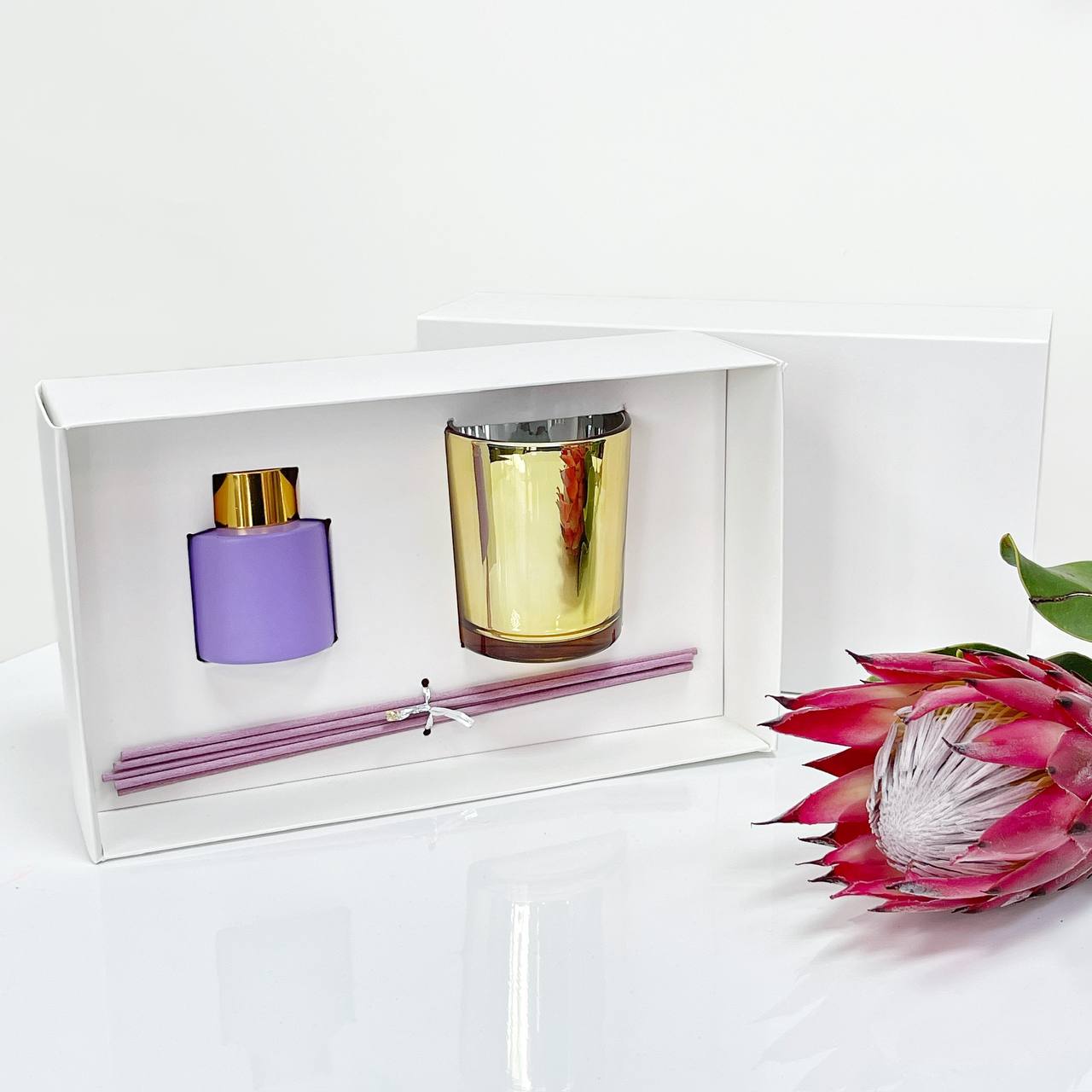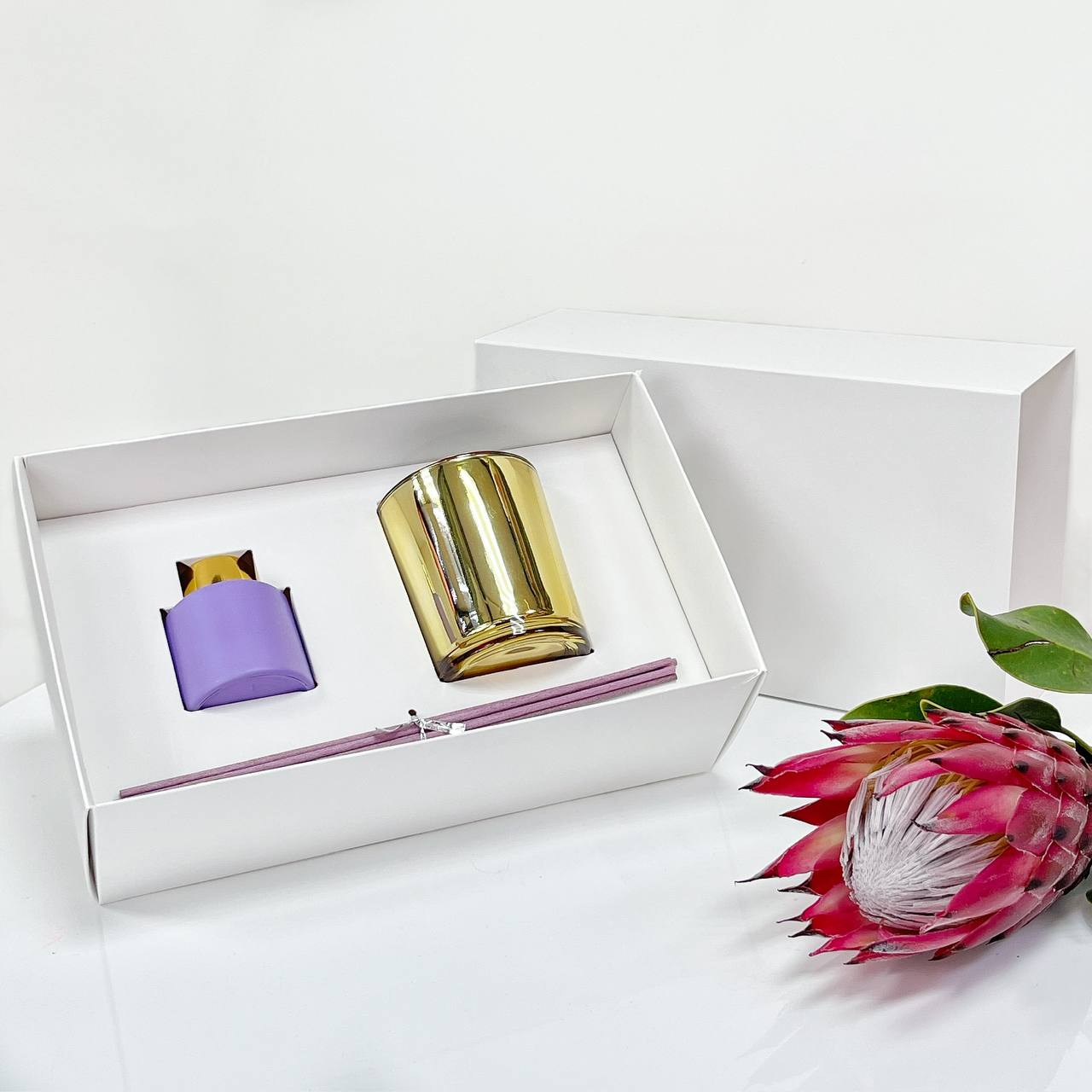 Описание: Белая матовая коробка с ложементом. Элегантный дизайн и удобная конструкция позволяют создать идеальный комплект для подарка свечи с диффузором.