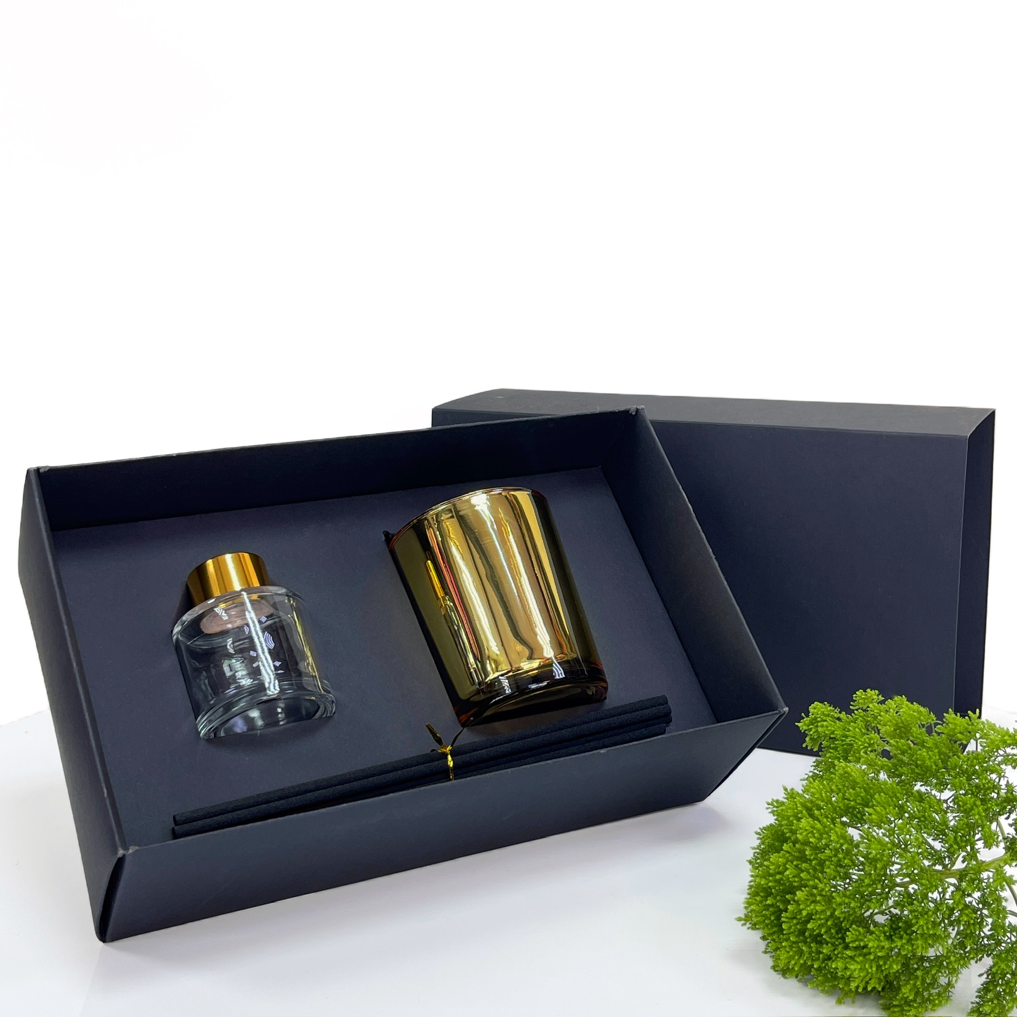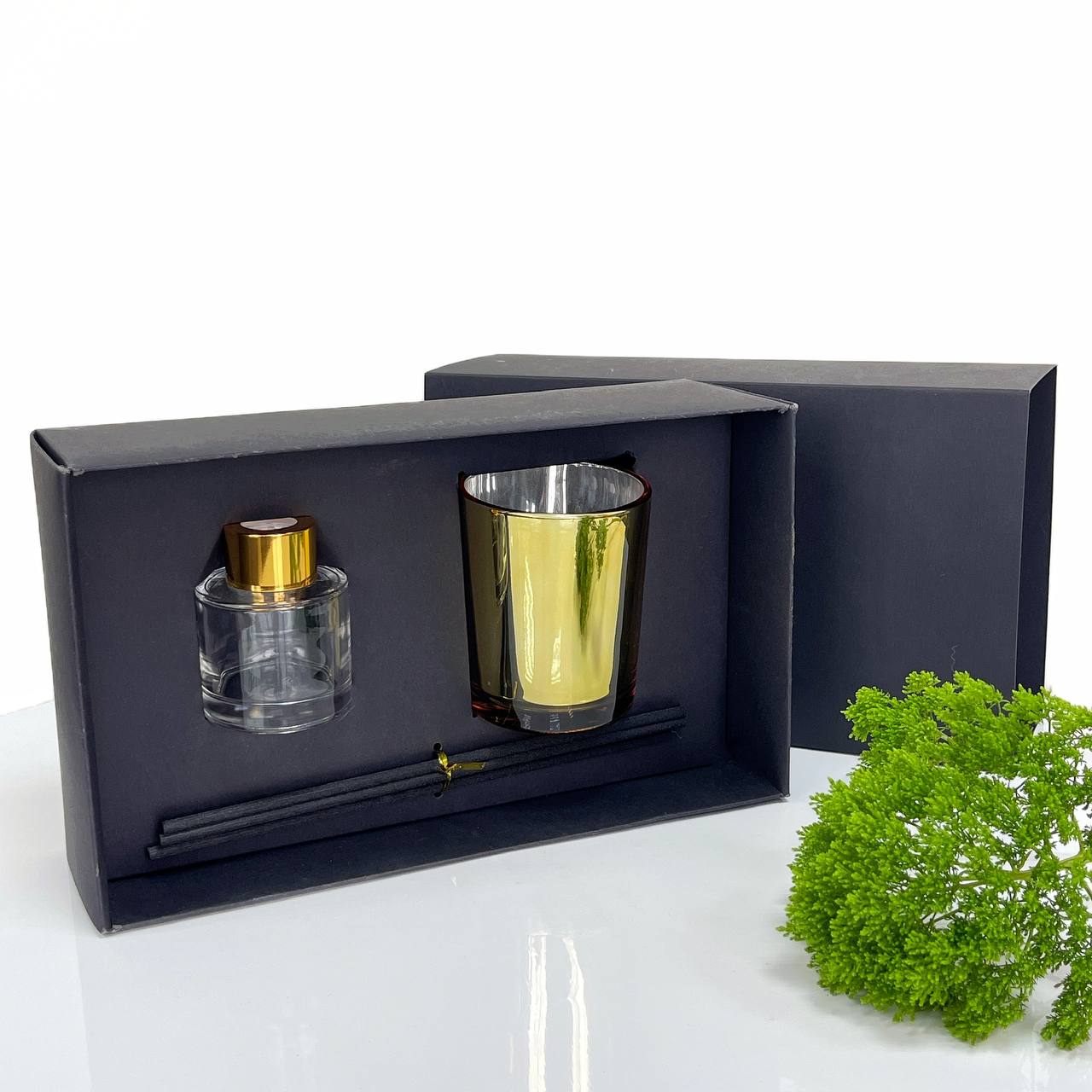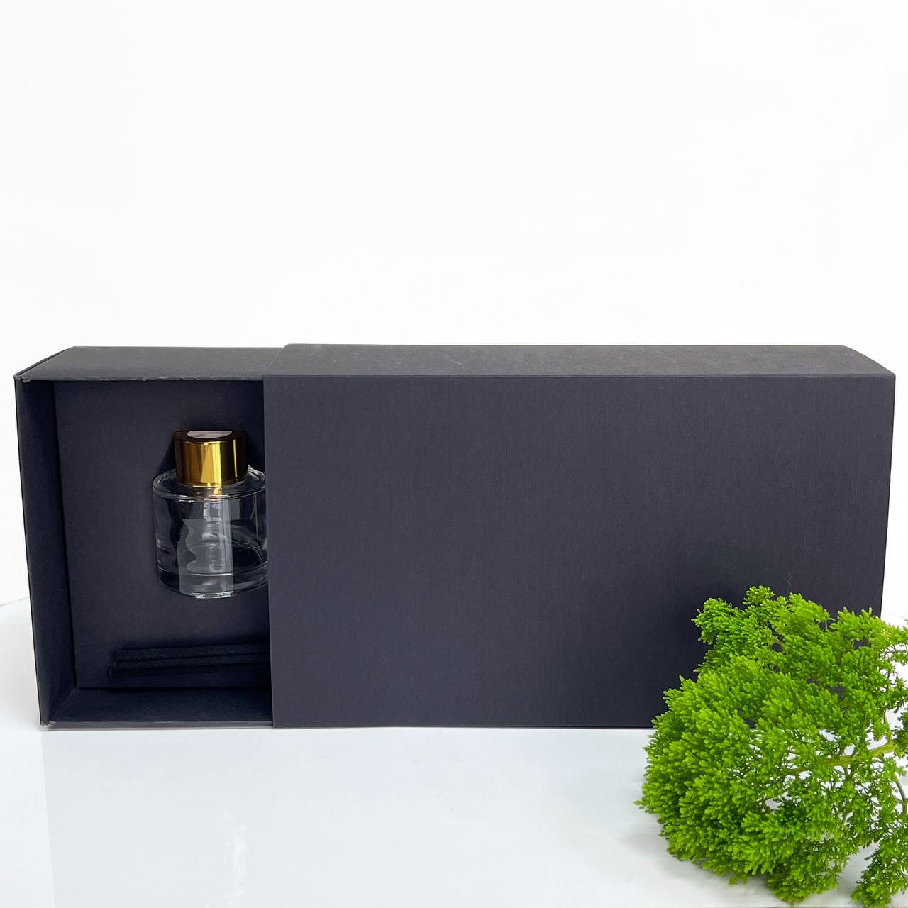Описание: Черная матовая коробка с ложементом. Элегантный дизайн и удобная конструкция позволяют создать идеальный комплект для подарка свечи с диффузором.