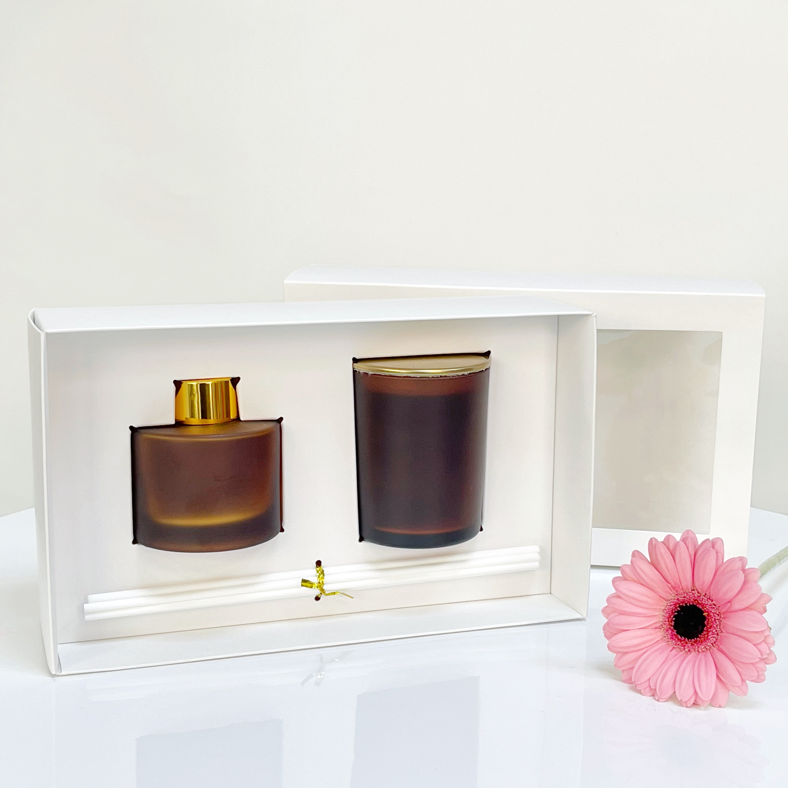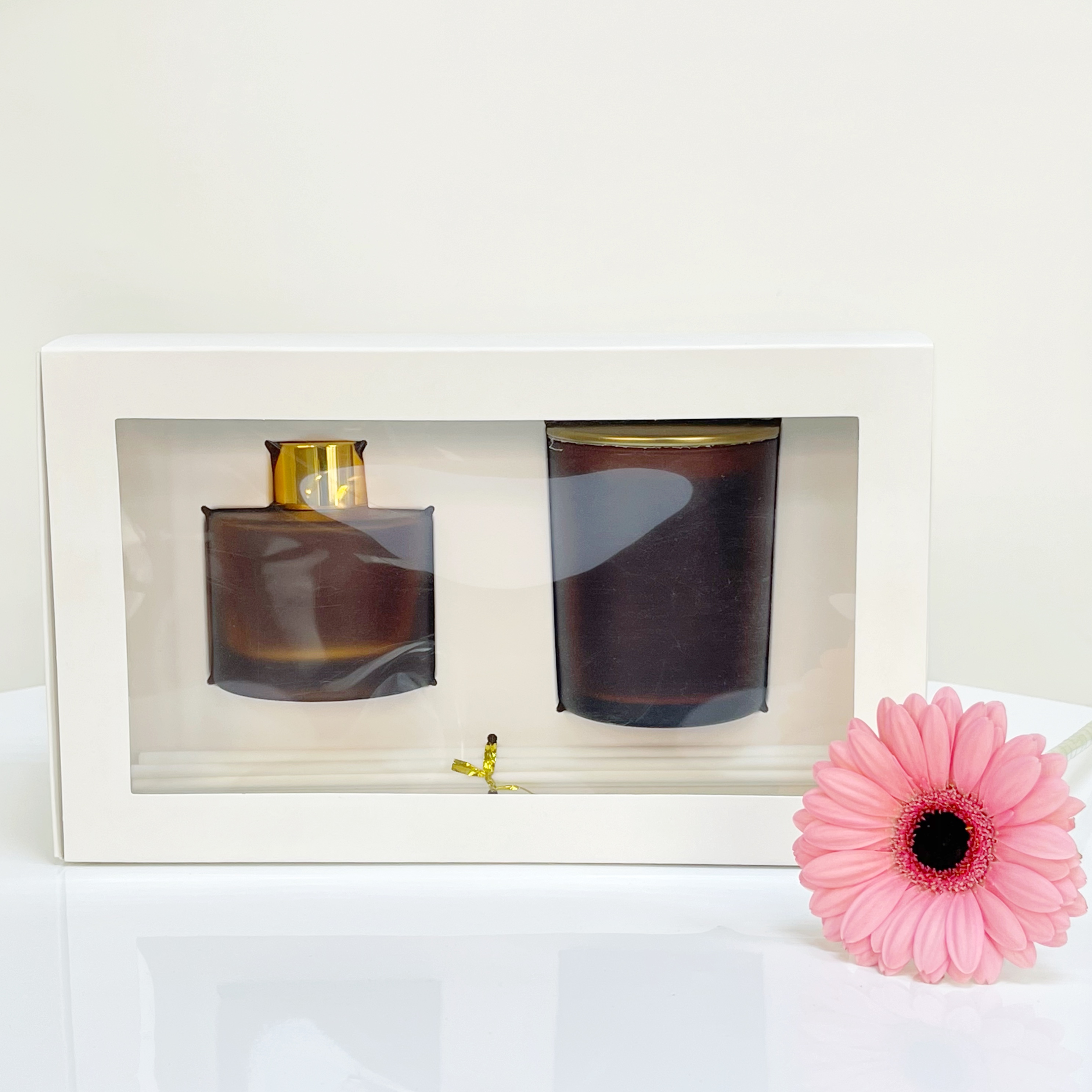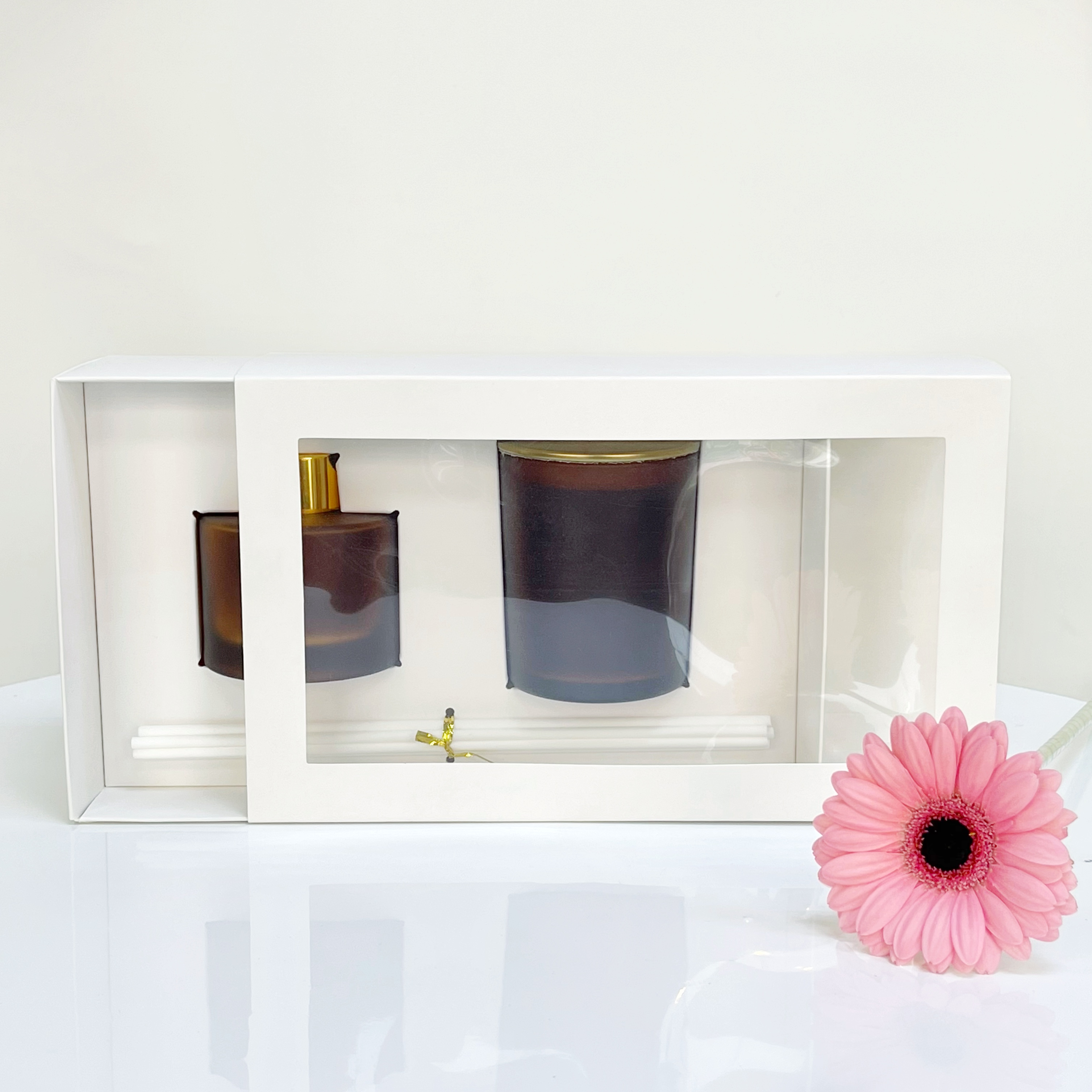 Описание: Белая матовая коробка с ложементом. Элегантный дизайн и удобная конструкция позволяют создать идеальный комплект для подарка свечи с диффузором.