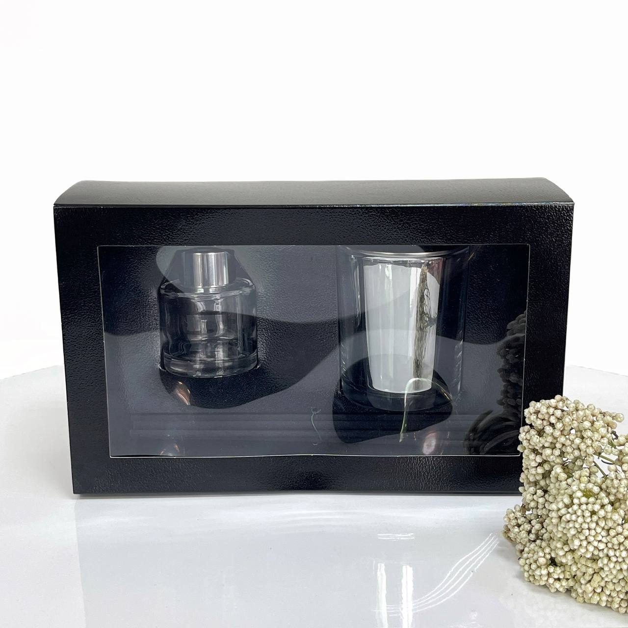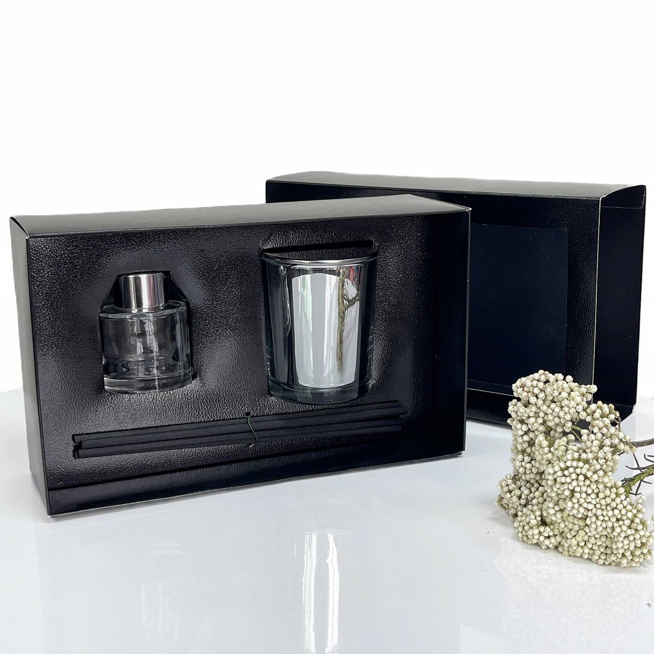 Описание: Черная глянцевая, текстурная коробка с ложементом . Элегантный дизайн и удобная конструкция позволяют создать идеальный комплект для подарка свечи с диффузором.
