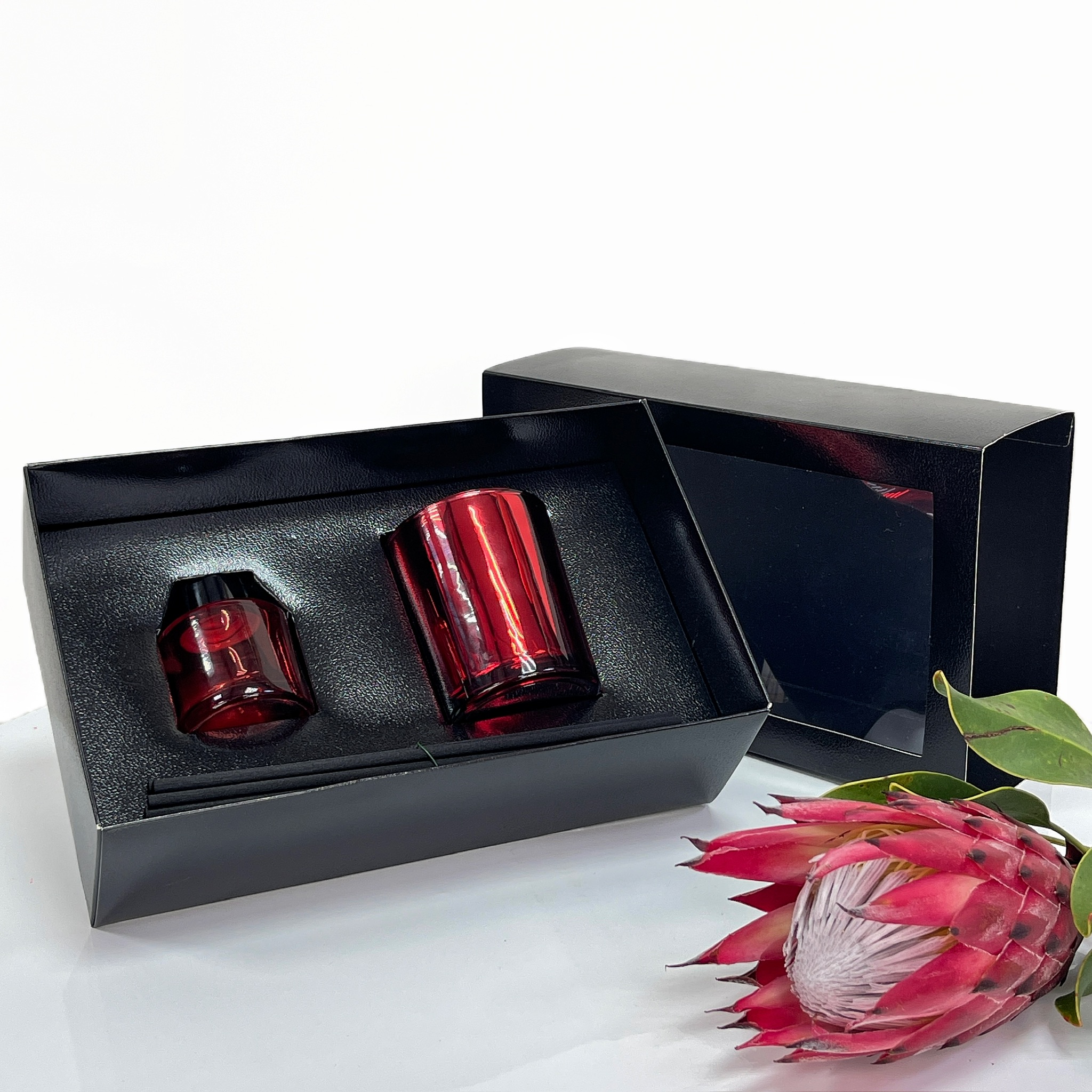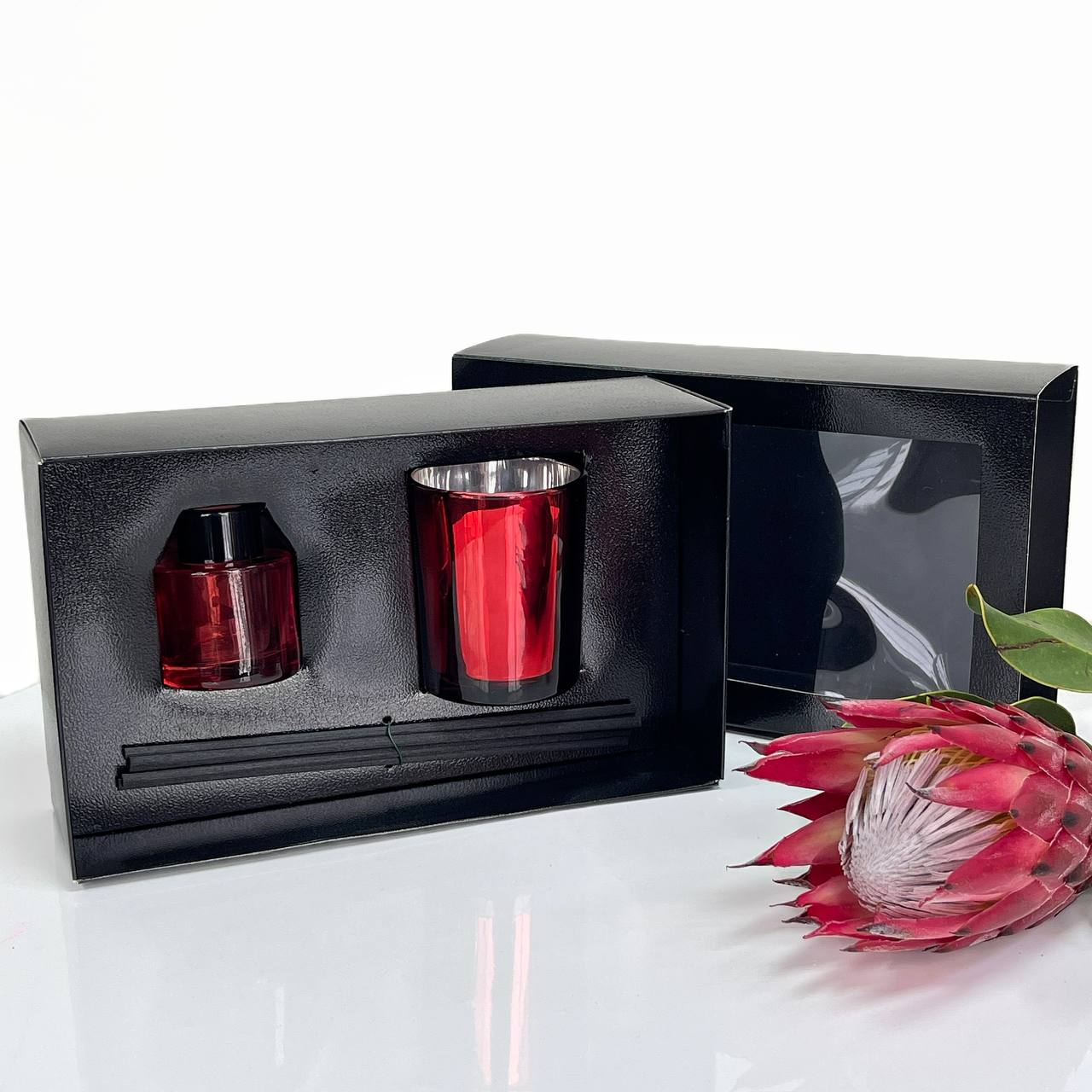 Описание: Черная глянцевая, текстурная коробка с ложементом . Элегантный дизайн и удобная конструкция позволяют создать идеальный комплект для подарка свечи с диффузором.