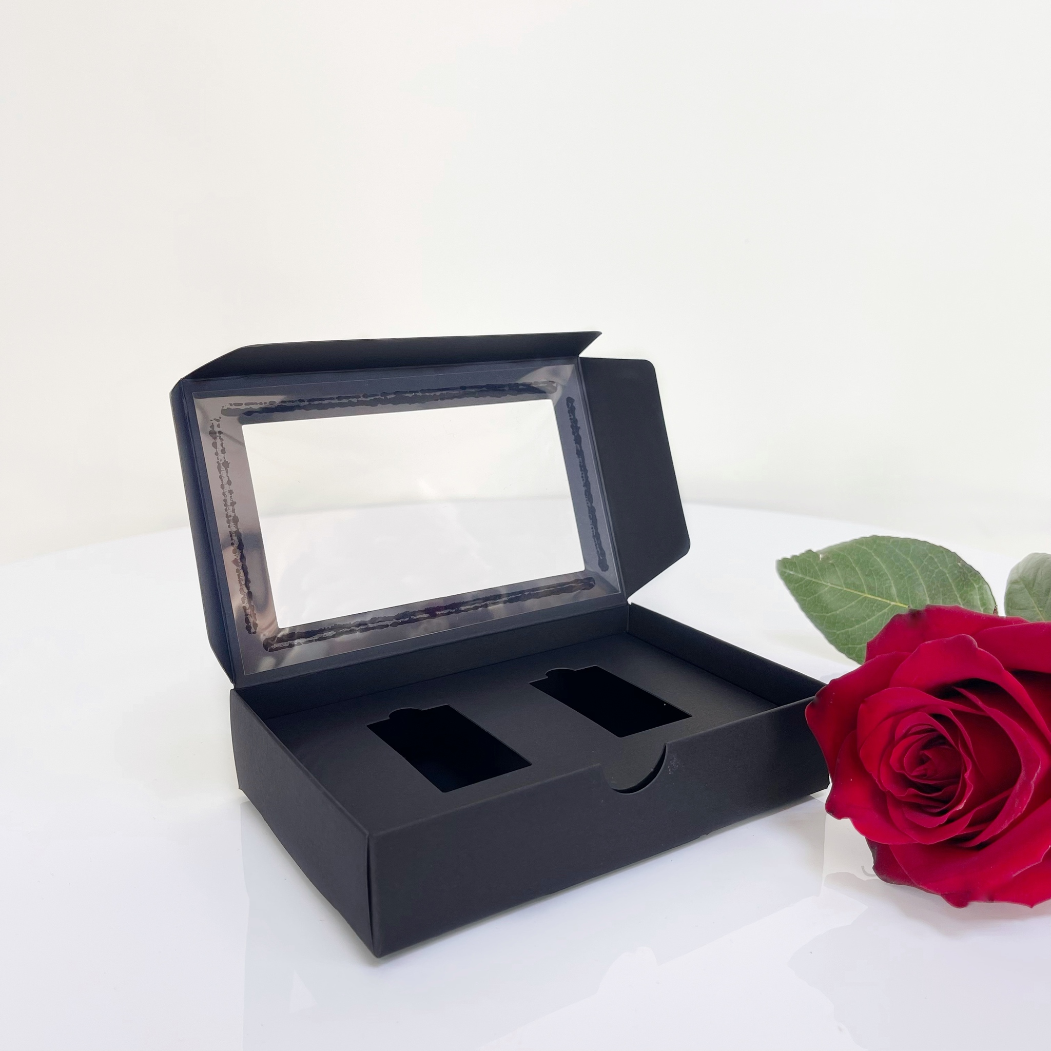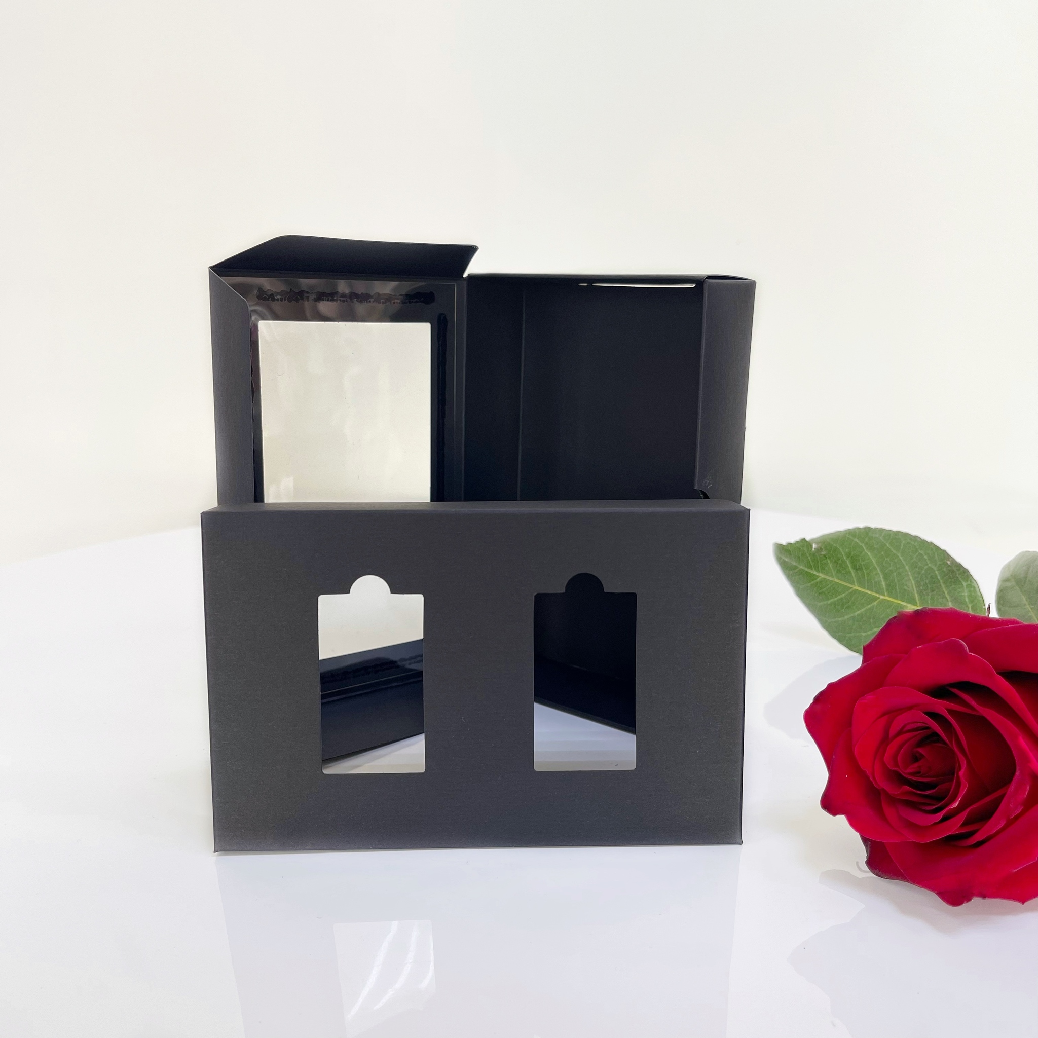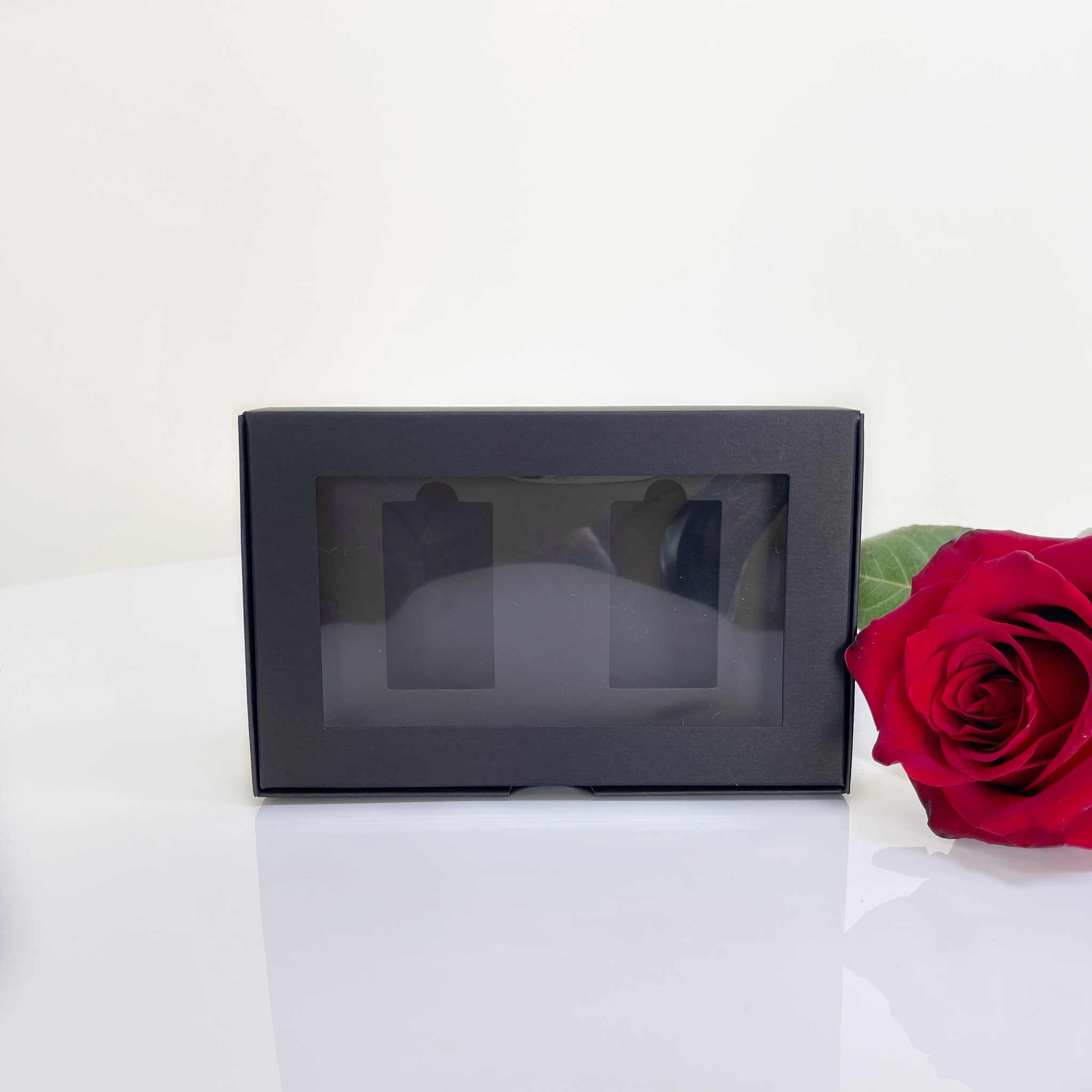 Черная картонная коробка с окошком идеально подойдет для упаковки 2 авто флаконов. Наша премиальная коробка обладает привлекательным черным матовым цветом, который делает ее элегантным дополнением к вашим товарам. Окошко привлекает дополнительное внимание покупателей и добавляет возможность показать товар не вскрывая упаковку. Материал - картон. Легко собирается без клея.
